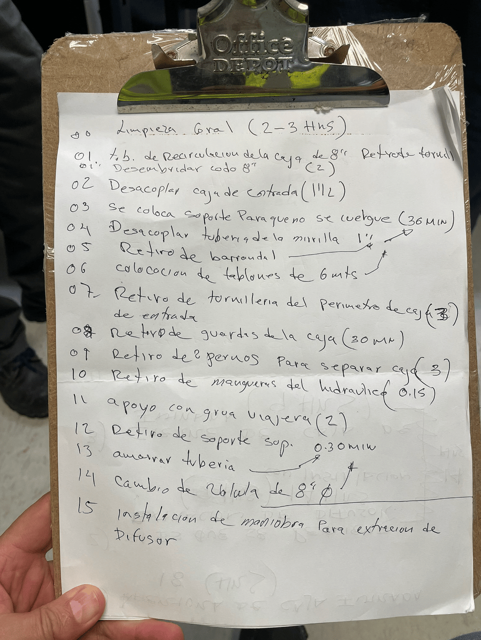 En uno de mis recorridos en planta, encontré una hoja escrita a mano con más de 15 pasos detallados para intervenir una máquina crítica: desde la limpieza, el desacople, el uso de la grúa, hasta cómo instalar el difusor.